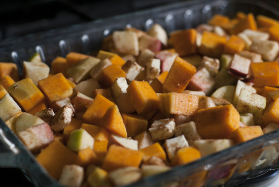 Last week I decided I would make a simple pork roast and was craving a side of this Squash Apple Bake to go with it. I called up my mom to ask her about how she used to bake it up and she told me that she had recently made it but had changed it a bit, with even better results! Instead of slicing and layering the apples and squash, she cubed everything up, tossed it together and baked it until tender. It cooked up faster and was easier to serve. Win, win.  I wasted no time in baking up a batch and the flavor was exactly how I remembered. Thanks, Minkis!