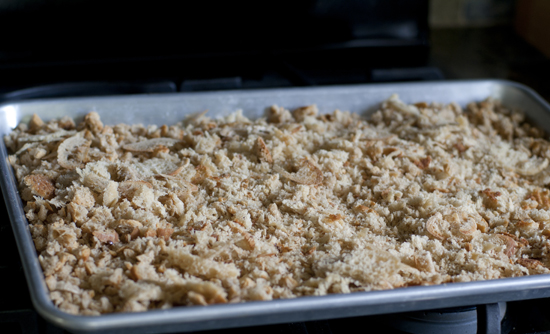Spread crumbs onto a rimmed baking sheet and bake at 350 degrees for about 20 minutes or until completely dry.