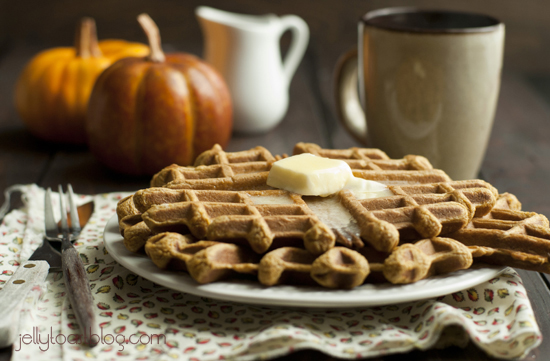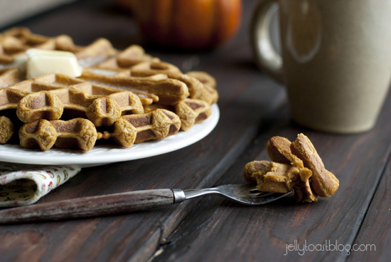I started rooting through my cupboards and came across a bottle of molasses and thought a gingerbread/pumpkin combo would be delish. Things came together pretty quickly after that, which is just what I love about a waffle/pancake mix mix. Well, that and the fact that if I am out of eggs, I can still make waffles. Wonky shaped waffles, as seen here, but waffles none the less.