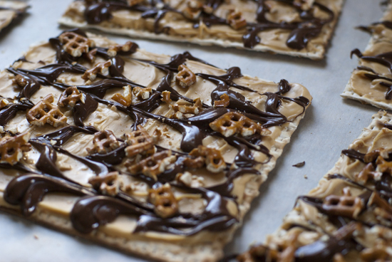 chocolate matzo bark with pretzels and wowbutter