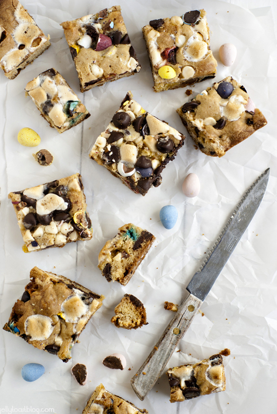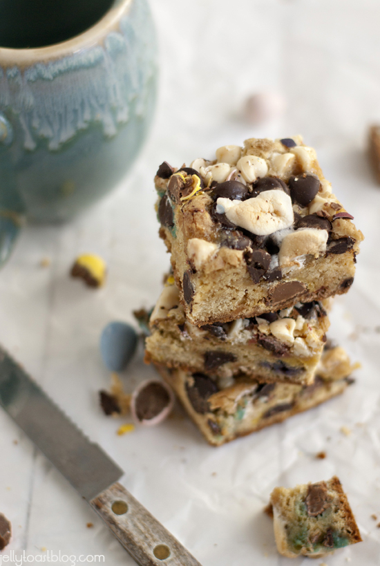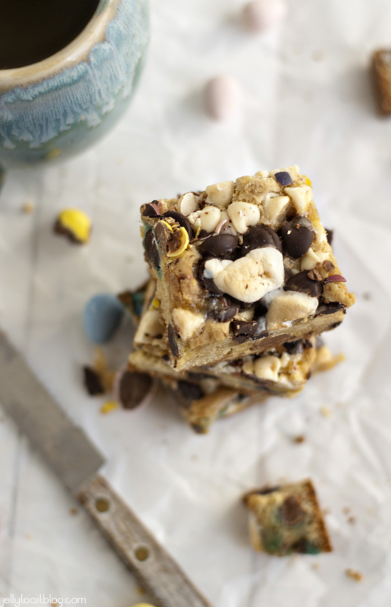 As a result of my most recent splurge in the Easter candy aisle, I whipped up this batch of Loaded Candy Cookie Bars. These bars are packed full of Cadbury Mini Eggs, white and dark chocolate chips as well as mini marshmallows. The marshmallows get all toasty on top like a s’mores, too. *sigh*
